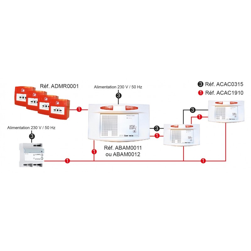 - Alimentation : Source principale : 230 Vca / Source secondaire : 1 batterie plomb sans entretien 12 V 7,2 Ah pour l’ECS